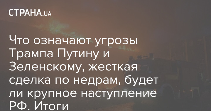 Трамп, як і раніше, хоче якнайшвидше підійти до припинення вогню. Українська влада він уже змусив до цього. Тепер намагається домовитися з РФ методом "батога і пряника" (загрози посилити санкції у разі відмови Москви йти на перемир'я та обіцянки їх зняти у разі згоди). При цьому Трамп веде і паралельну, але не менш для нього важливу, лінію - встановити фактичний контроль над процесом повоєнного відновлення України через так звану угоду надрах, яка забезпечить американцям першочергове право на участь в інвестиційних проектах, а також дасть право на отримання доходів від розробки українських надр. Оскільки Зеленський, вочевидь, у такому вигляді не хоче підписувати угоду, Трамп йому й загрожує "великими проблемами". Можливо, втім, крім "батога" Трампа для Зеленського має і якийсь "пряник" у вигляді фінансової та/або політичної складової в обмін на підписання угоди. Втім, якщо він і є, то привселюдно про нього не говорять.
