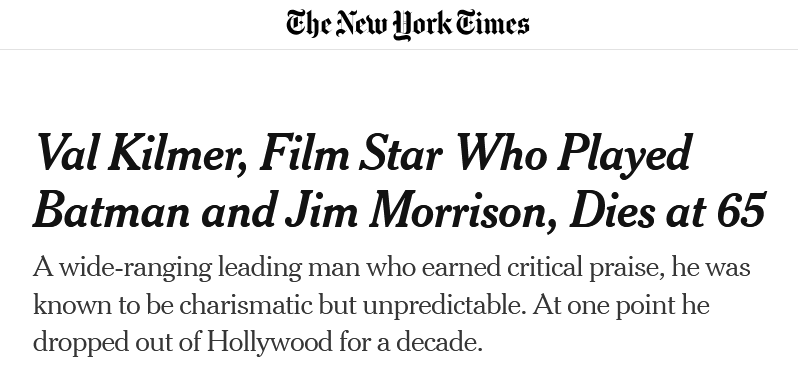 Голлівудський актор Вел Кілмер, відомий головною роллю у фільмі "Бетмен назавжди", помер у віці 65 років.