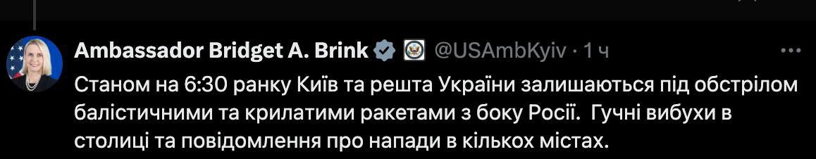 Зазначимо, що вже сьогодні, коментуючи удар балістикою по Києву, Брінк зазначила, що його завдала РФ, але не закликавши при цьому Росію до відповіді. У Центрі протидії дезінформації при РНБО, проте, назвали це "прогресом".