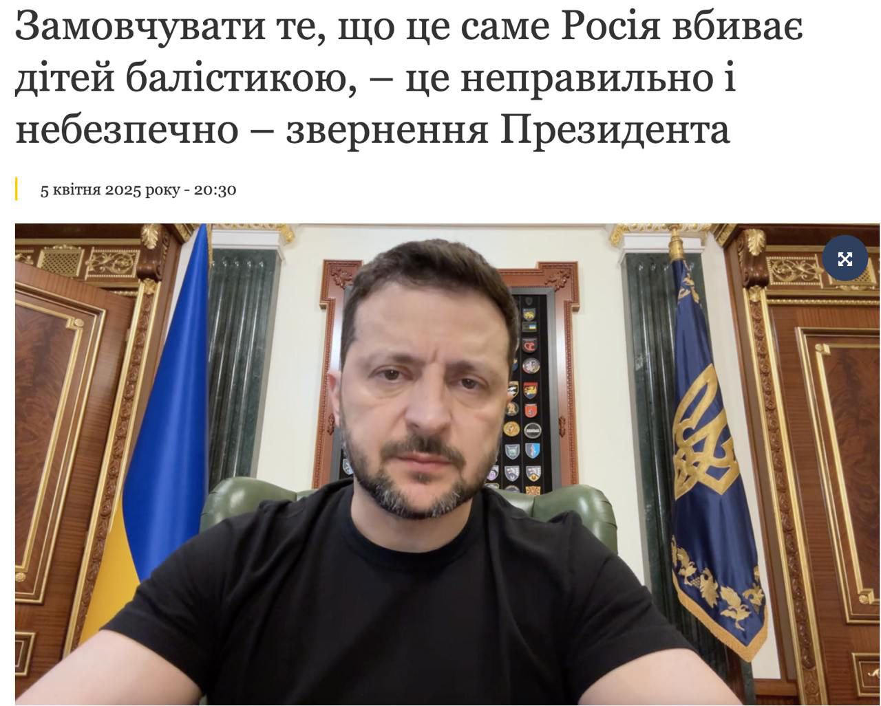 Він заявив, що "неправильно та небезпечно замовчувати про те, що це Росія вбиває дітей баллістикою". Цю думку Офіс президента виніс у назву текстової версії звернення.