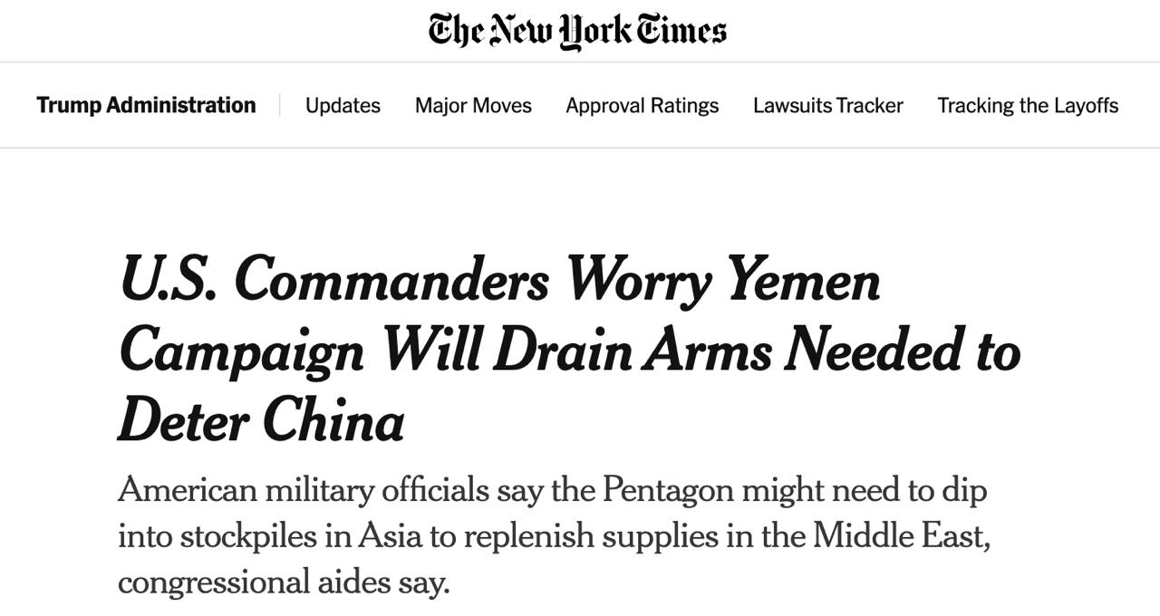 Міністерство оборони США стурбоване тим, що удари по Ємену та допомога Україні виснажують американські запаси високоточної зброї великої дальності, необхідні для можливої війни з Китаєм.