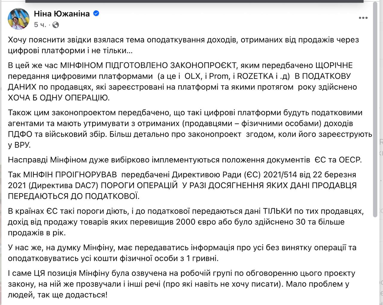 "Мінфіном підготовлений законопроект, яким передбачена щорічна передача цифровими платформами (а це і OLX, і Prom, і Rozetka і т.д.) до податкової інформації про продавців, зареєстрованих на платформі і які протягом року здійснили хоча б одну операцію. Також цим законопроектом передбачено, що такі цифрові платформи будуть фізичними і особами) доходів ПДФО та військовий збір", - написала нардеп.
