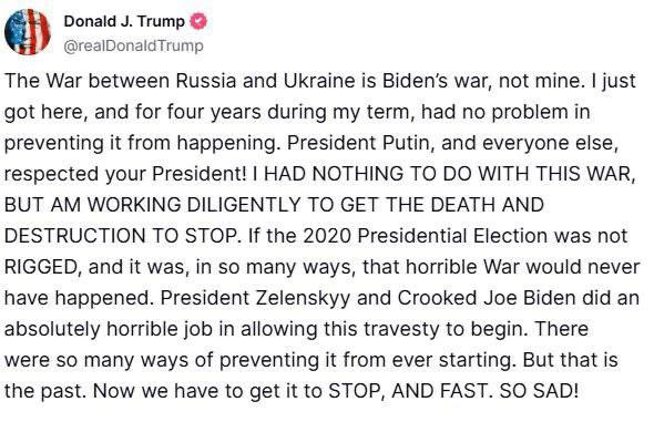 "Війна між Росією та Україною - це війна Байдена, не моя. Я не мав жодного відношення до цієї війни, але зараз докладаю зусиль, щоб зупинити смерть і руйнування. Якби президентські вибори 2020 року не були сфальсифіковані, цієї жахливої війни ніколи б не сталося. Президент Зеленський та брехливий Джо Байден зробили жахливу роботу, дозволивши розпочатися цій трагедії. Існувала безліч способів її запобігти. Але це вже у минулому. Зараз потрібно зупинити це – і швидко", – написав Трамп.