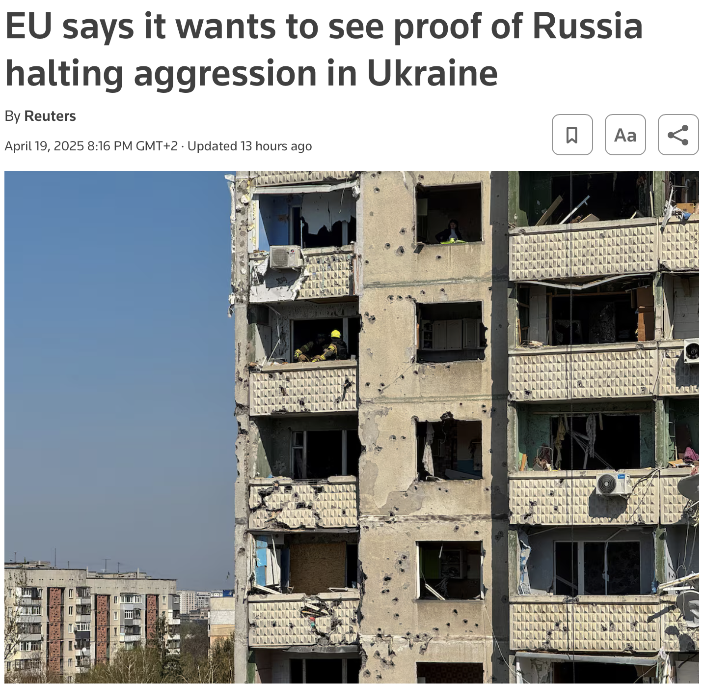 У Євросоюзі у відповідь на оголошення пасхального перемир'я Володимиром Путіним заявили, що хочуть спочатку побачити докази припинення агресії Росії в Україні.