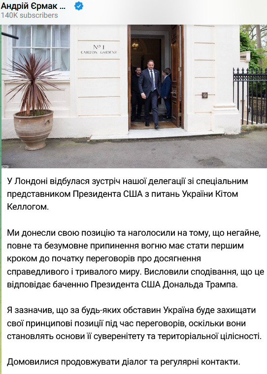 Глава Офісу президента Андрій Єрмак все ж таки зустрівся зі спецпредставником президента США Дональда Трампа Кітом Келлогом на переговорах у Лондоні.