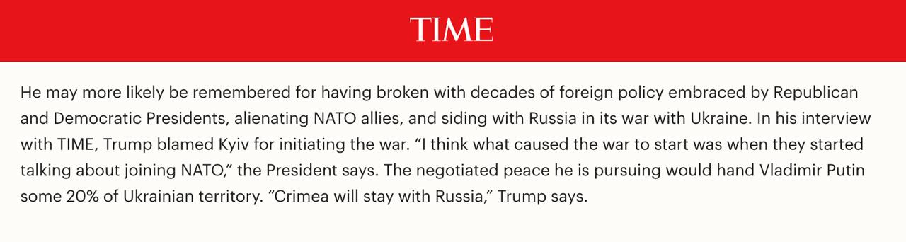"Крим залишиться із Росією". Трамп дав інтерв'ю The Time, в якому звинуватив Україну в початку війни