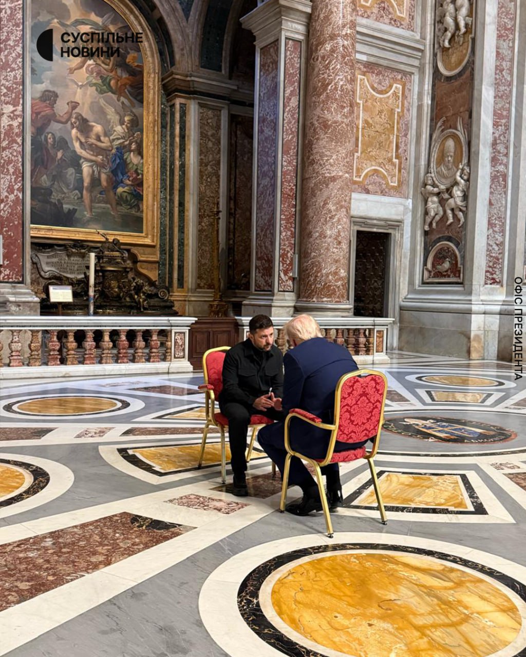 "Президенти зустрілися у Базиліці Святого Петра, зустріч тривала близько 15 хвилин. Лідери домовилися продовжити переговори сьогодні. Команди працюють над організацією продовження зустрічі", – розповів речник Сергій Никифоров.