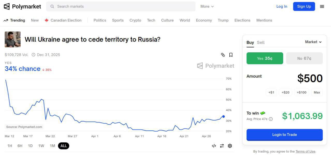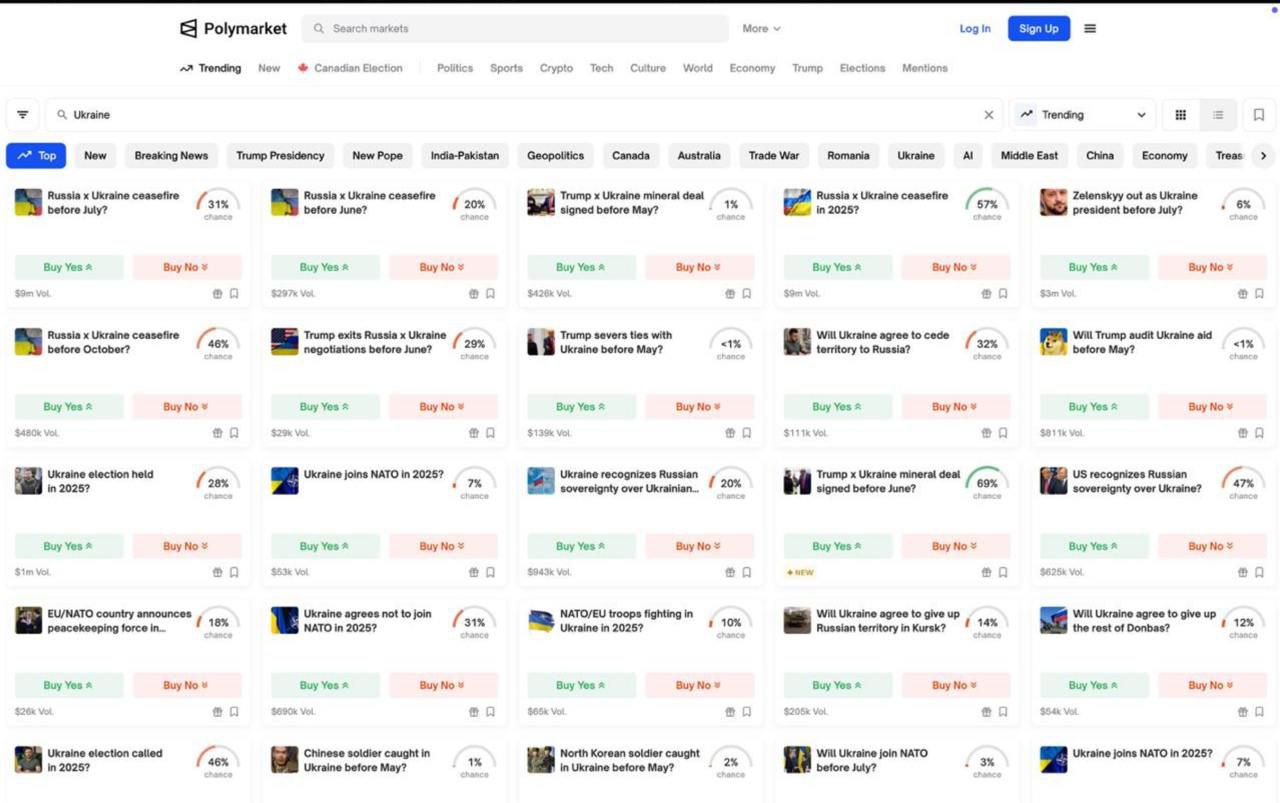 На міжнародній букмекерській платформі Polymarket сьогодні відкрито десятки ставок, які стосуються подій в Україні.