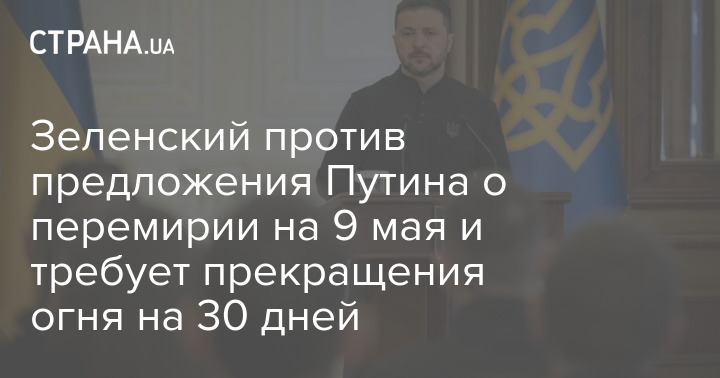 Президент України Володимир Зеленський відкинув пропозицію російського лідера Володимира Путіна щодо триденного перемир'я на 9 травня та наполягає на припиненні вогню на 30 днів.