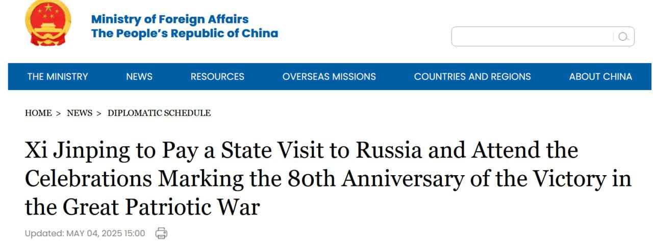 "На запрошення президента Російської Федерації Володимира Путіна голова КНР Сі Цзіньпін з 7 по 10 травня відвідає Росію з державним візитом і візьме участь в урочистостях з нагоди 80-х роковин перемоги у Другій світовій війні в Москві", - йдеться у повідомленні.