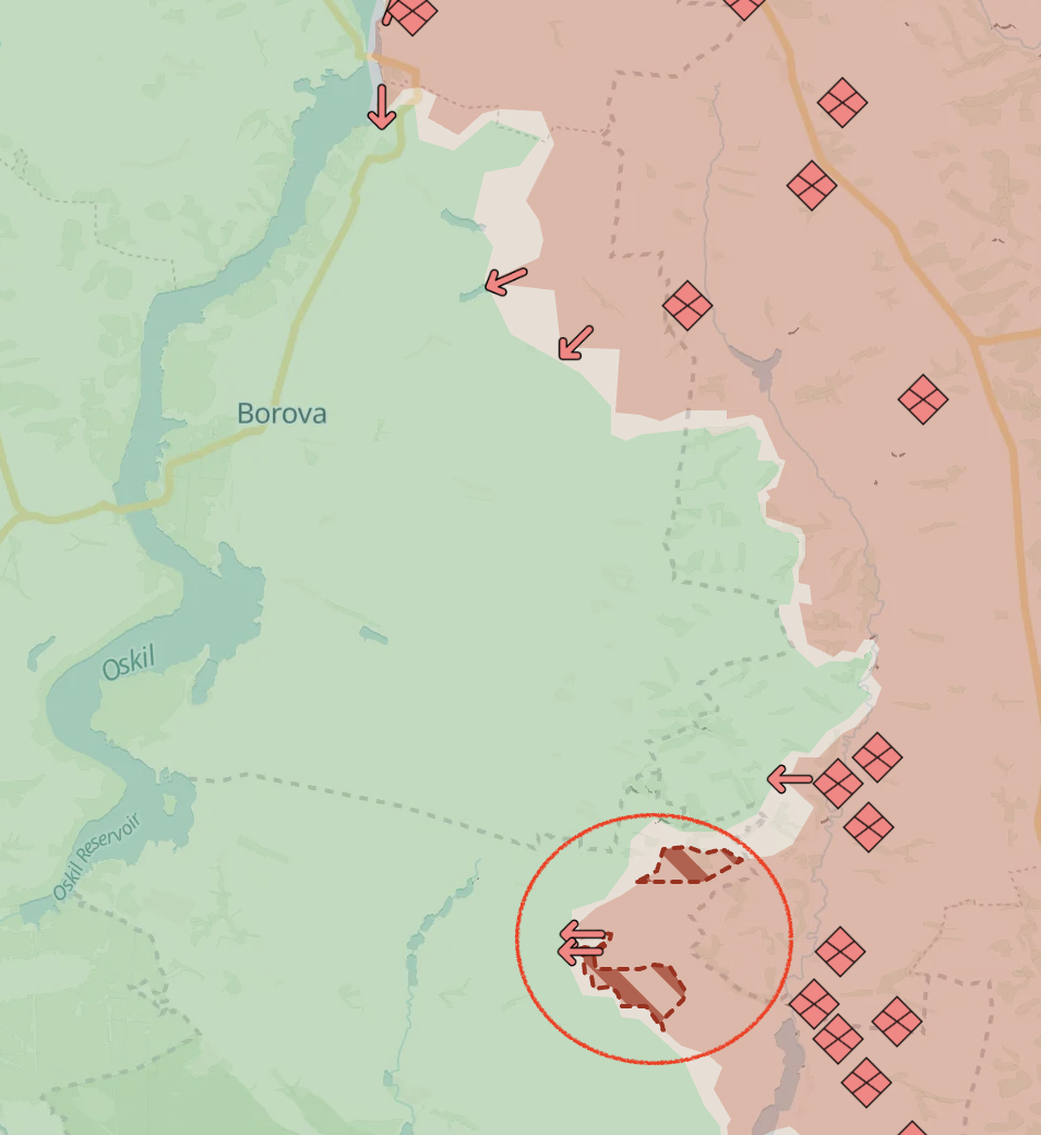 Він пише, що війська РФ намагаються повністю захопити панівні висоти в районі села Нове, що може спричинити прорив фронту на Осколі.