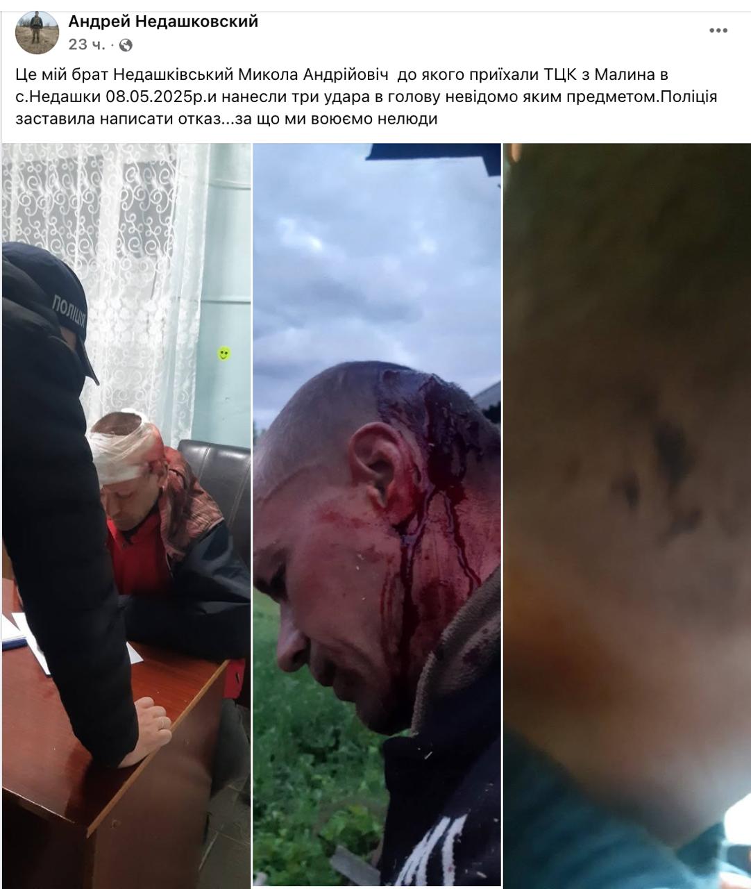 "Це мій брат Недашковський Микола Андрійович, до якого приїхали ТЦК з Малина до села Недашки 08.05.2025 і завдали три удари по голові невідомим предметом. Поліція змусила написати відмову... За що ми воюємо, нелюди", - написав мешканець Березані.