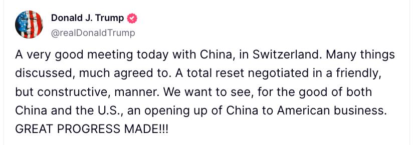 "Дуже хороша зустріч сьогодні з Китаєм, у Швейцарії. Багато обговорювалося, багато було узгоджено. Тотальне перезавантаження, узгоджене у дружній, але конструктивній манері. Ми хочемо бачити, на благо як Китаю, так і США, відкриття Китаю для американського бізнесу. Досягнуто великого прогресу!" - йдеться у повідомленні.
