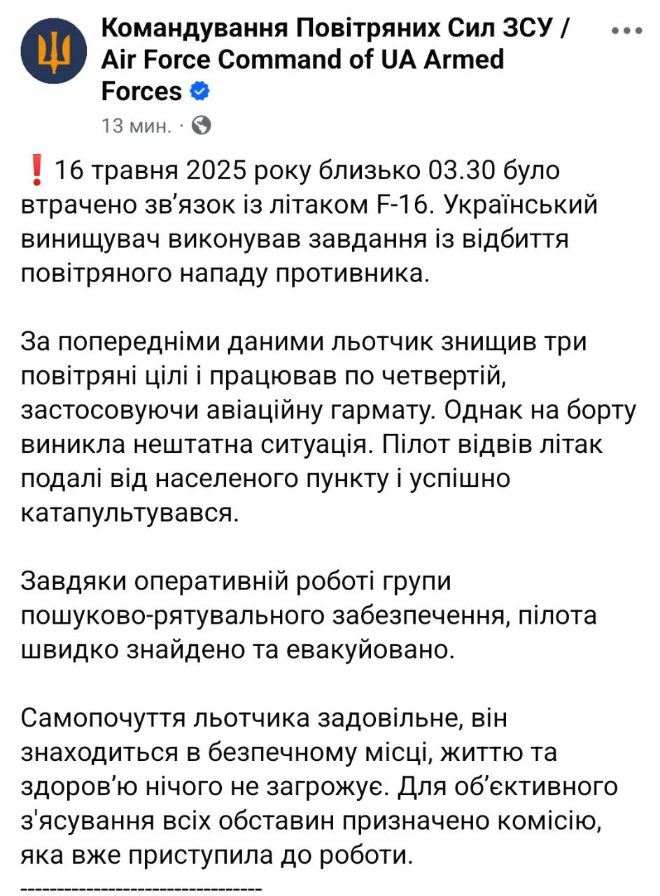 08:05 Україна втратила ще один винищувач F-16, повідомляють Повітряні сили ЗСУ.