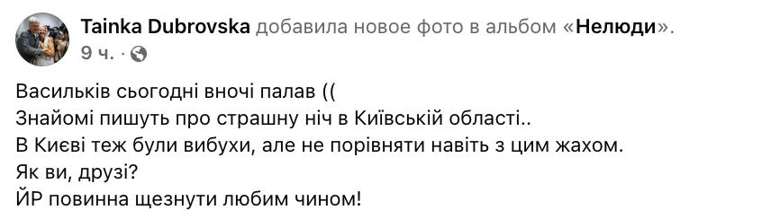 Волонтер Олена Рябая з Василькова назвала цю повітряну атаку РФ "вночі страху та криків переляканих дітей".