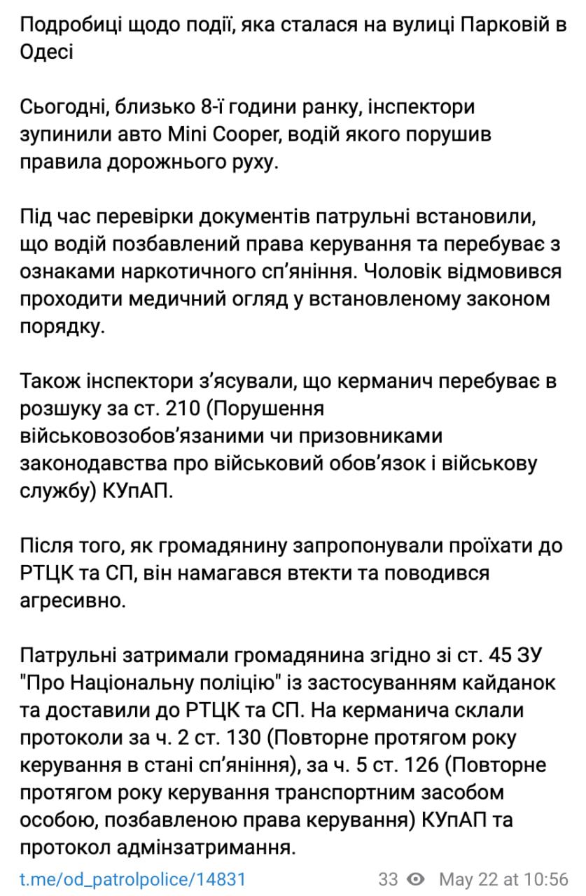 У місцевій поліції повідомили, що його авто зупинили за порушення правил дорожнього руху та запідозрили, що чоловік під наркотиками. Також виявилось, що він у розшуку ТЦК.