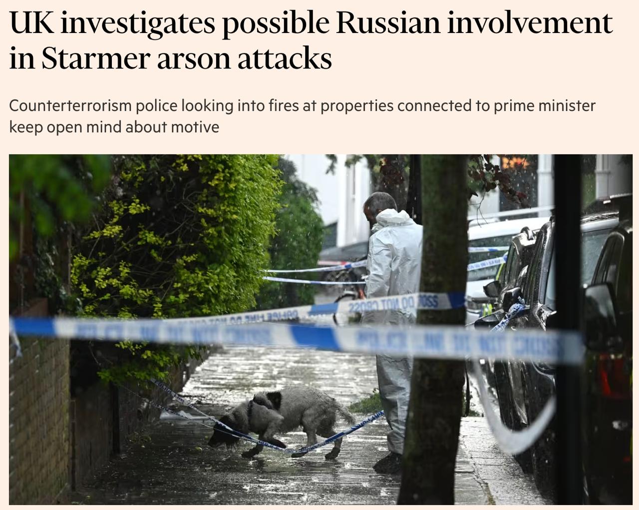 "Британські чиновники зі сфери безпеки розслідують, чи була Росія залучена до... підпалів власності, пов'язаної зі Стармером", - йдеться у повідомленні.