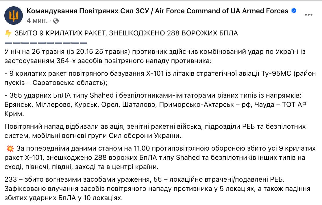 Сьогодні вночі, за даними ЗСУ, територію країни атакували 355 ударних БПЛА. 288 із них збито.