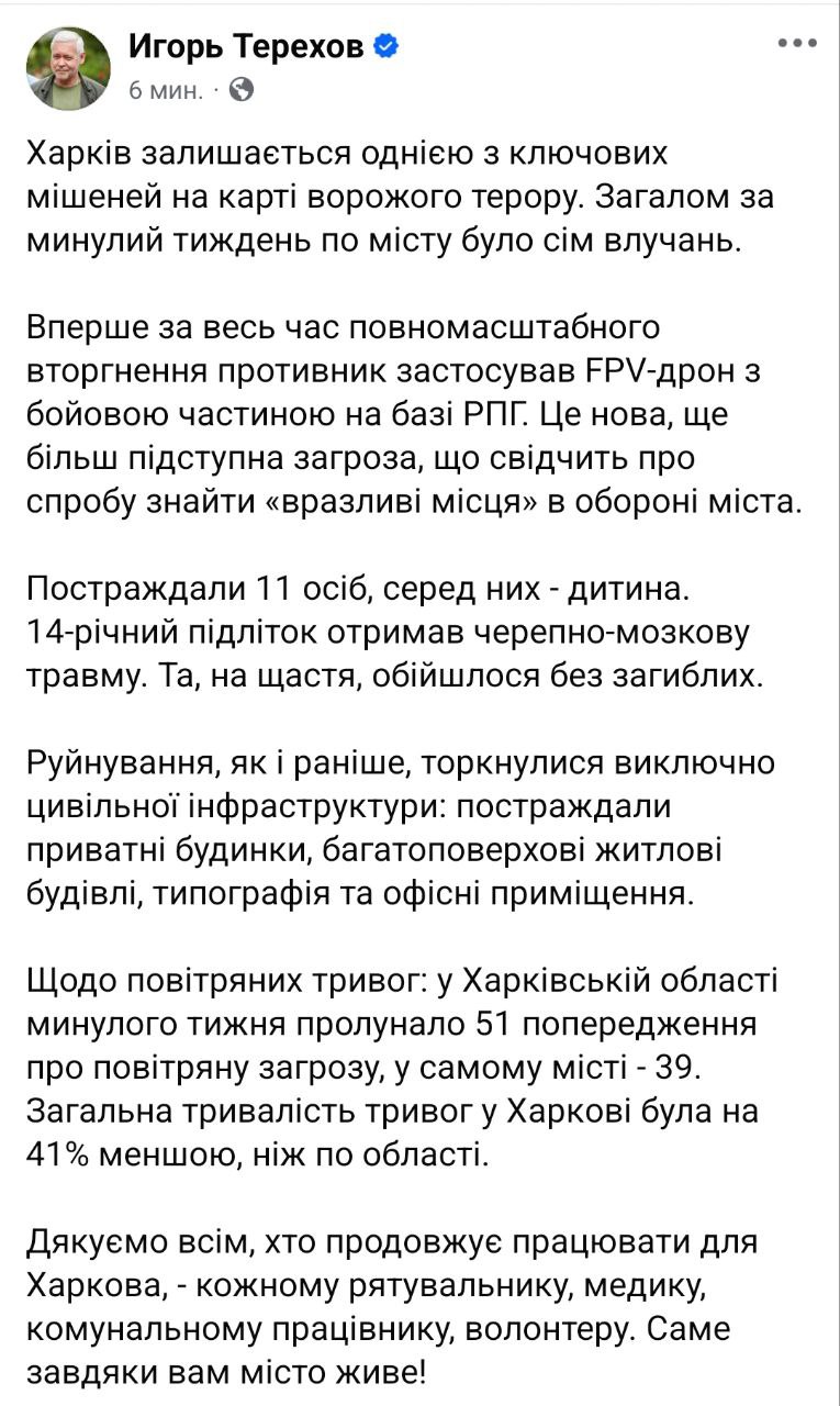 14:02 Щодо Харкова вперше застосували FPV-дрон з бойовою частиною від РПГ. Про це повідомив мер міста Ігор Терехов.