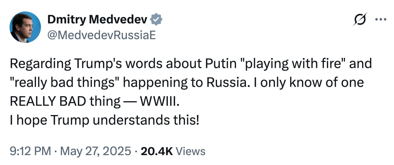 "Я знаю тільки одну справді погану річ – це третя світова. Сподіваюся, Трамп це розуміє!" - Написав заступник глави російського Радбезу.