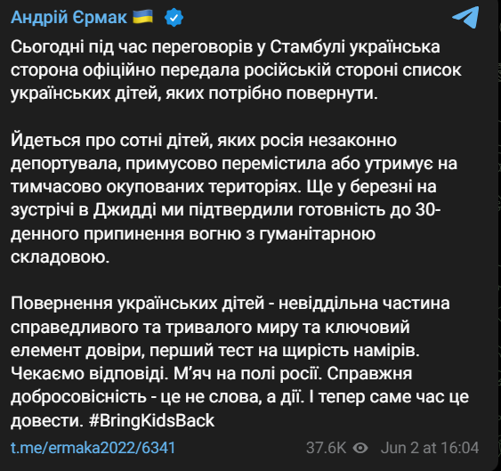"Повернення українських дітей - невіддільна частина справедливого та тривалого миру та ключовий елемент довіри, перший тест на щирість намірів. Чекаємо відповіді. М'яч на полі росії", - пише голова ОП.