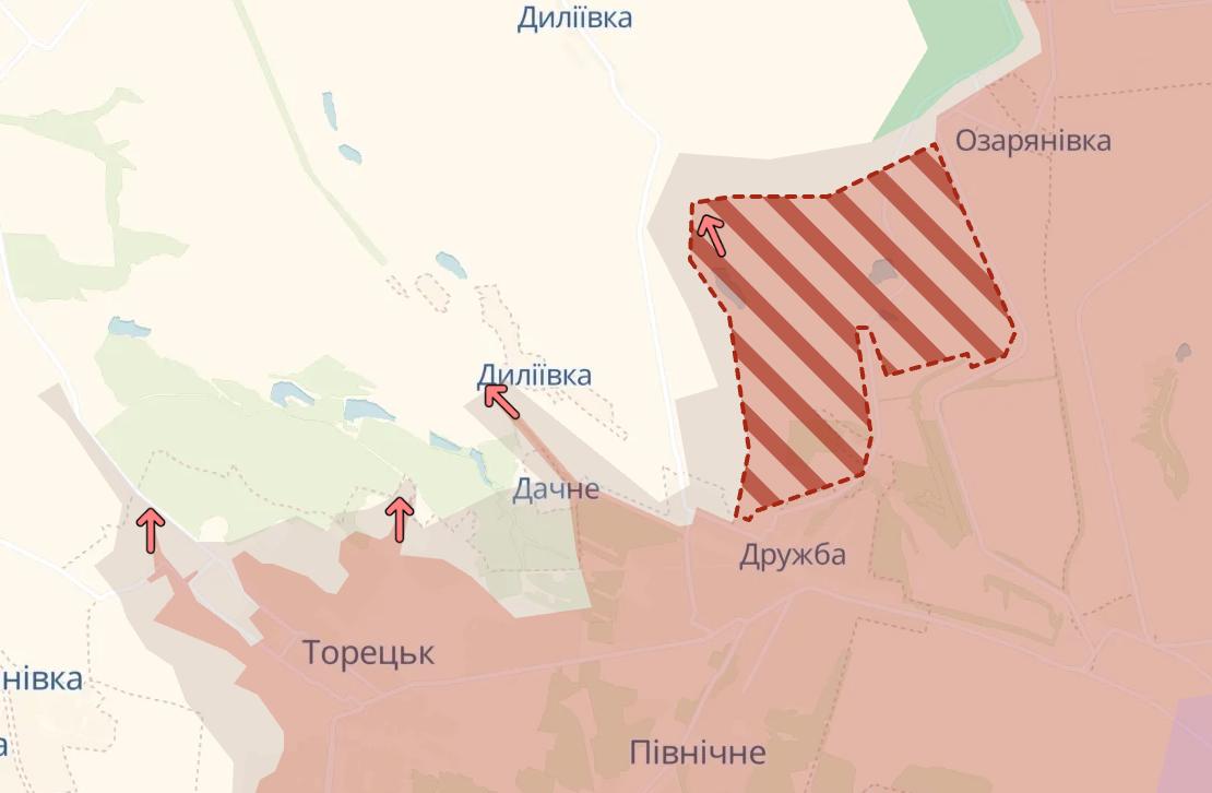 У Донецькій області Deep State фіксує великий поступ РФ на північ від Торецька - в районі Диліївки.