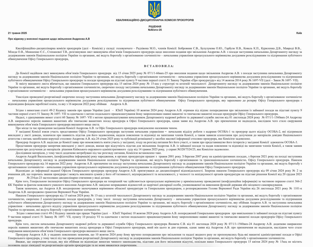 Згідно з рішенням, 21 травня КДКП розглянула подання в.о. генпрокурора Олексія Хоменка про звільнення з посади заступника начальника Департаменту Офісу Генерального прокурора з нагляду за виконанням законів Нацполіцією Андрія Андрєєва.
