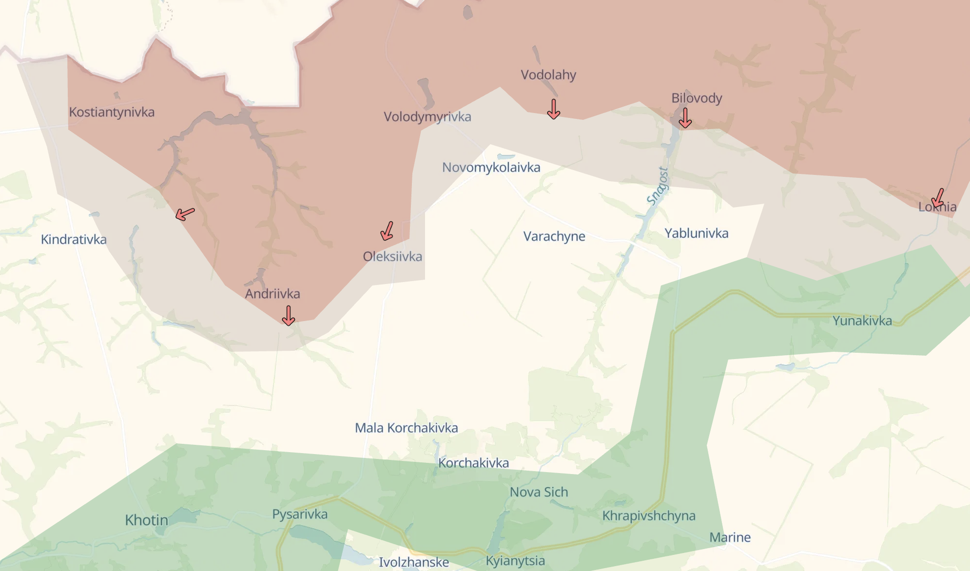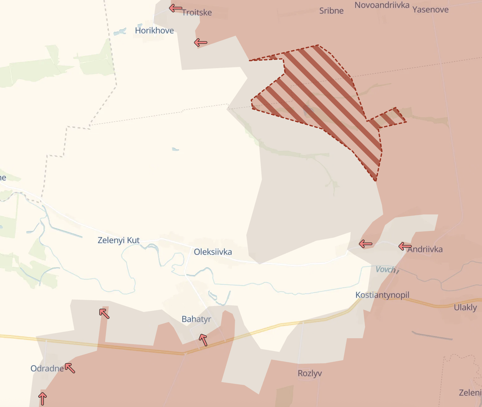 Також російські паблики стверджують, що їхні війська сьогодні зайшли на територію Дніпропетровської області на захід від села Оріхове і закріпилися там. Україна цього не підтверджувала. На карті Deep State, фронт у районі Горіхового не змінився, а саме село лише частково у сірій зоні.