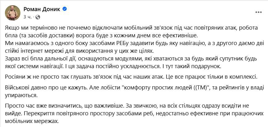 "Ми намагаємося з одного боку засобами РЕБ задавити будь-яку навігацію, а з другого даємо дві стійкі інтернет мережі для використання у цих же цілях. Зараз всі бпла дальньої дії, оснащуються модулями, які хватаються за будь-який супутник будь-якої системи навігації. І це завдання постійно ускладнюється. Росіяни ж не просто так глушать у себе зв'язок під час наших атак", - пише Доник.