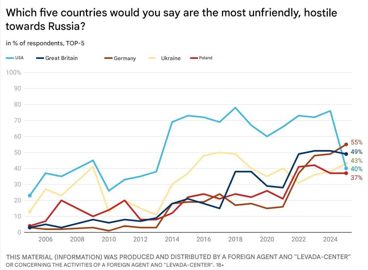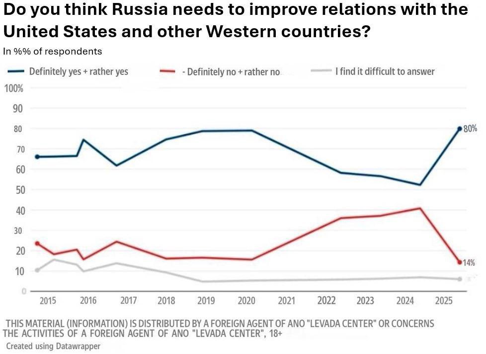 Водночас серед населення РФ зросла підтримка ідеї покращення відносин із західними країнами, включаючи США. 2024 року за нормалізацію виступали 52% респондентів, а 2025-го цей показник досяг 80%, ставши найвищим за весь період спостережень з 2015 року.