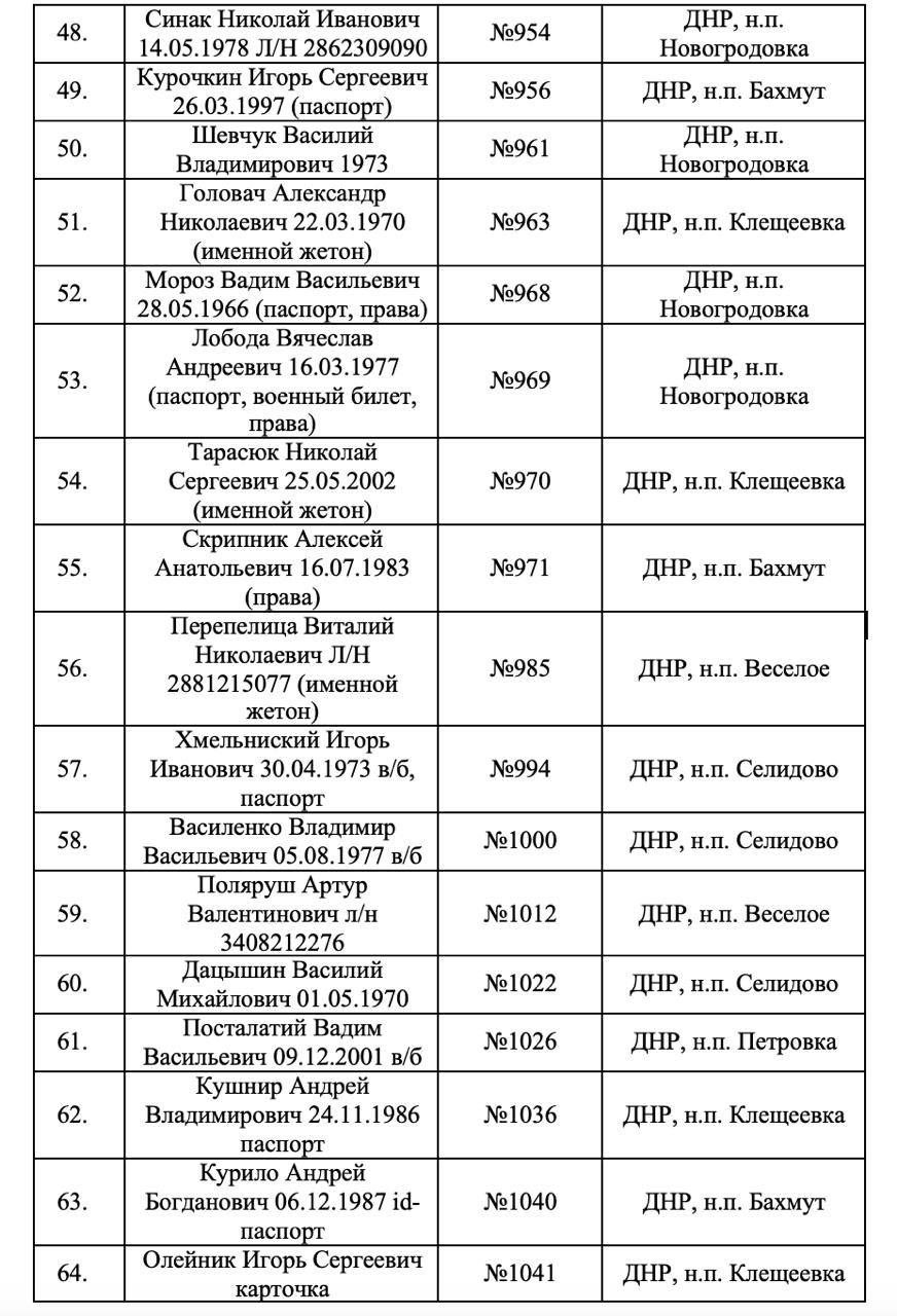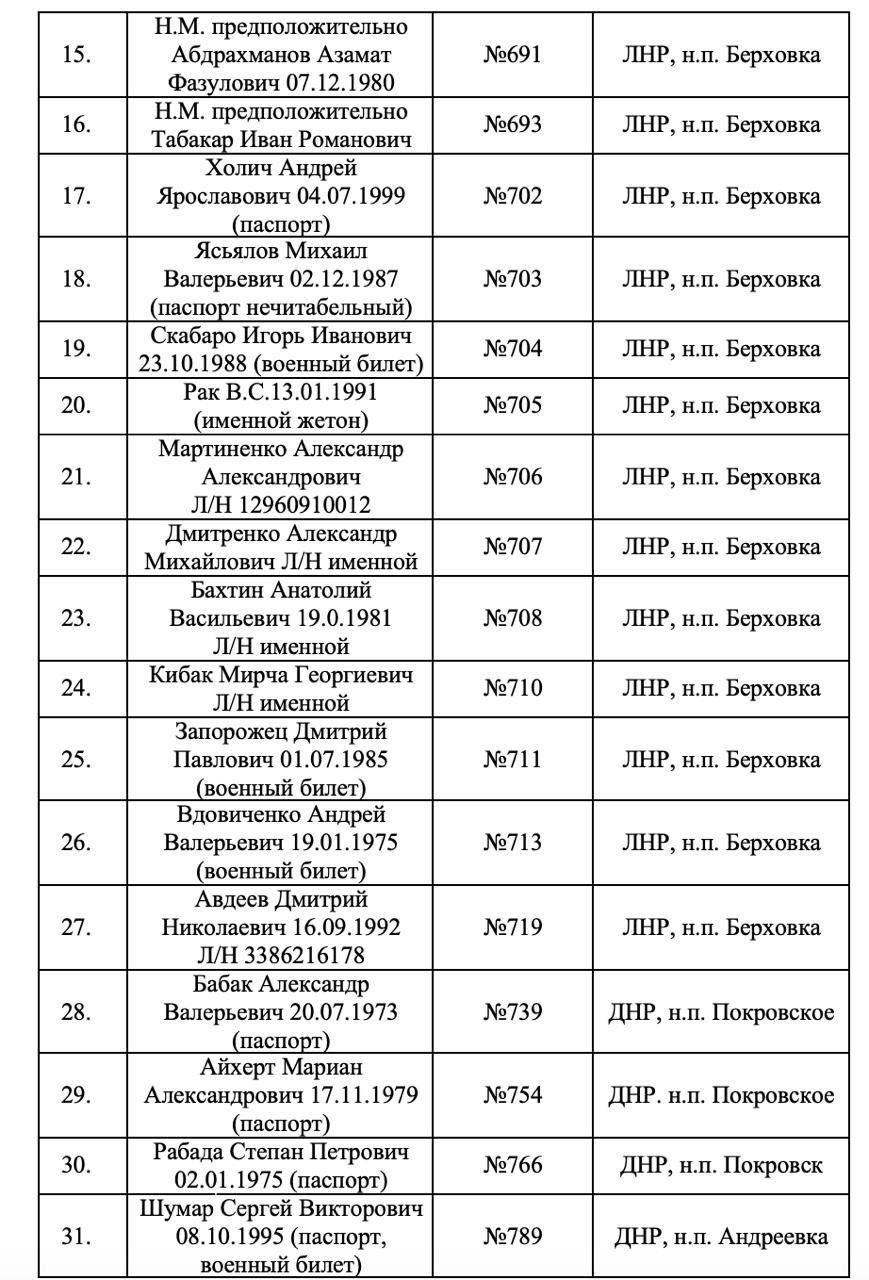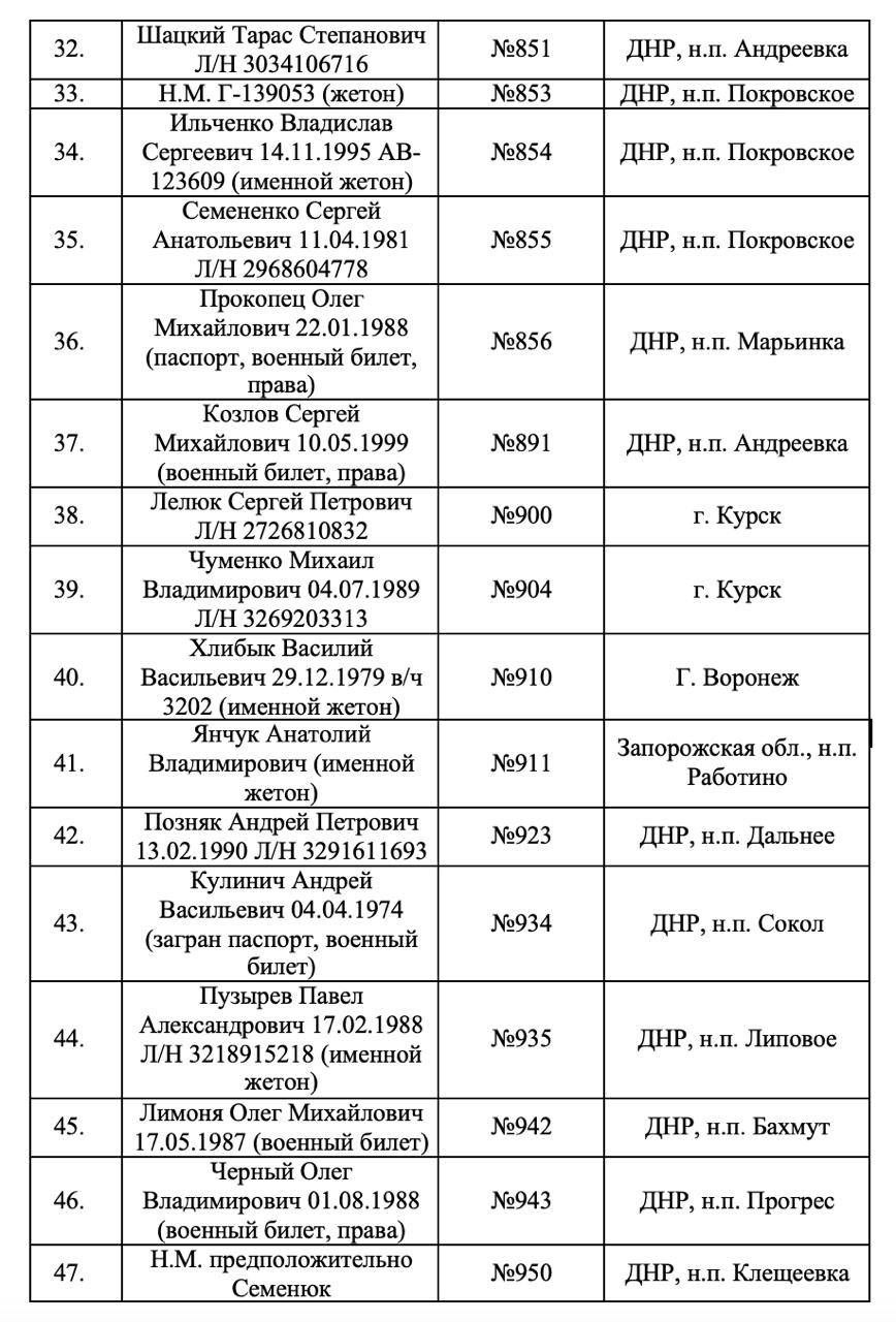 Чиновник виклав прізвища 121 військового, які загинули, як випливає з таблиць, на різних ділянках фронту від Курської до Донецької області. Судячи з усього, тіла були зібрані в різні періоди, оскільки в ньому значаться загиблі, зокрема, з Авдіївки, де основні бої точилися в 2023-2024 роках.