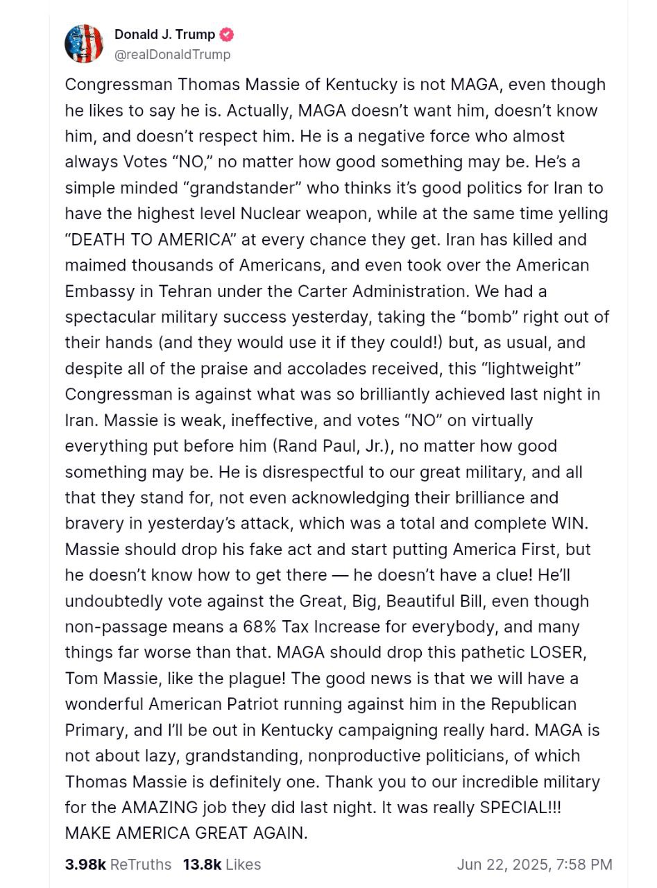 У своїй соцмережі він розкритикував конгресмена-республіканця Томаса Мессі, який днями приєднався до групи демократів, які бажають заблокувати можливість Трампа розпочати війну без схвалення Конгресу.