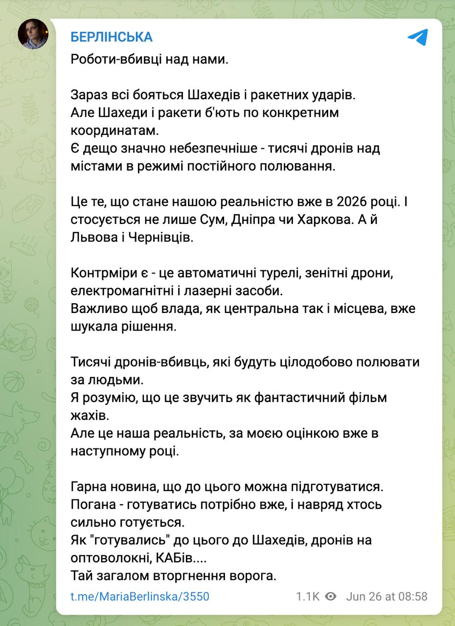 "Тисячі дронів-вбивць, які цілодобово полюватимуть на людей. Я розумію, що це звучить як фантастичний фільм жахів. Але це наша реальність, за моєю оцінкою, вже наступного року. І стосується не лише Сум, Дніпра чи Харкова. Але й Львова та Чернівців", - пише Берлінська.