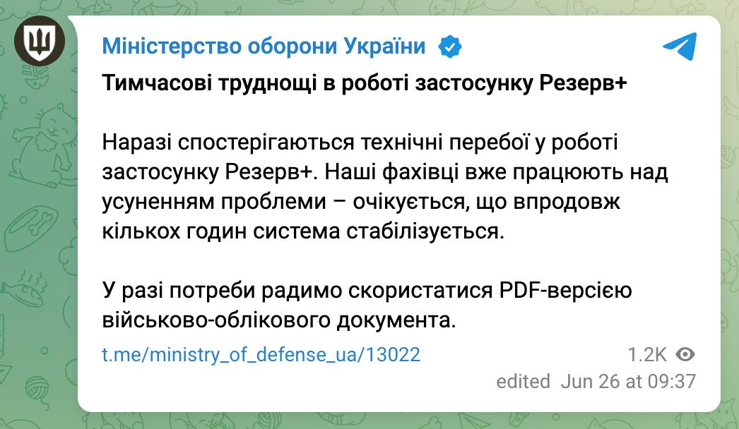 09:45 Про збій у роботі "Резерву+" повідомляє Міноборони.