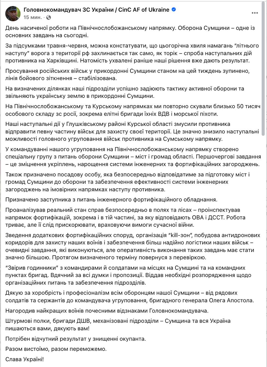 "Просування російських військ у прикордонній зоні Сумщини цього тижня зупинено, лінію бойового зіткнення - стабілізовано. На певних ділянках наші підрозділи успішно застосовують тактику активної оборони і звільняють українську землю в прикордонні Сумської області. За підсумками травня-червня можна констатувати, що надалі захлинається так само, як і минулого року – тоді це була спроба наступальних дій противника на Харківщині", - пише Сирський.
