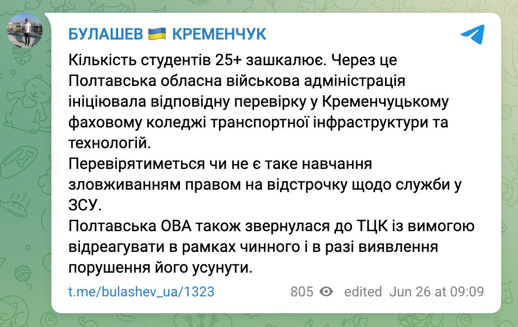 "Перевірятиметься, чи не є таке навчання зловживанням правом на відстрочку від служби у ЗСУ. Полтавська ОДА також звернулася до ТЦК з вимогою відреагувати в рамках чинного законодавства і у разі виявлення порушення його усунути", - пише Булашев.