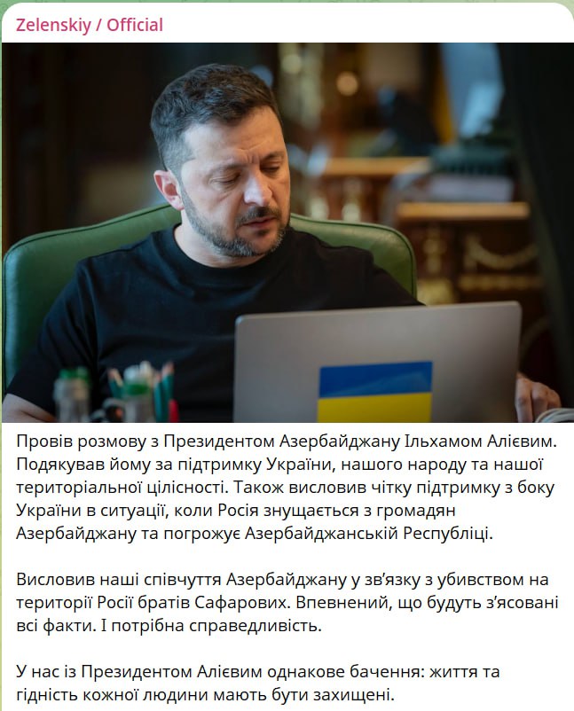 "Виразив чітку підтримку з боку України в ситуації, коли Росія знущається з громадян Азербайджану та загрожує Азербайджанській Республіці. Висловив наші співчуття Азербайджану у зв'язку з вбивством на території Росії братів Сафарових", - написав Зеленський.