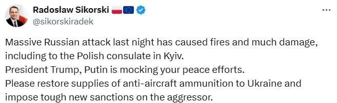 "Масована російська атака вчора ввечері викликала пожежі і завдала великих збитків, у тому числі польському консульству в Києві. Президент Трамп, Путін глузує з ваших мирних зусиль. Будь ласка, відновіть постачання зенітних ракет в Україну і введіть жорсткі санкції проти агресора", - сказав він.