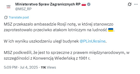 "МЗС направило до посольства Росії ноту, в якій висловило рішучий протест проти авіаударів щодо населення України. У результаті постраждала будівля посольства Польщі в Україні. Це суперечить міжнародному праву, зокрема Віденській конвенції 1961 року", - сказано в публікації.