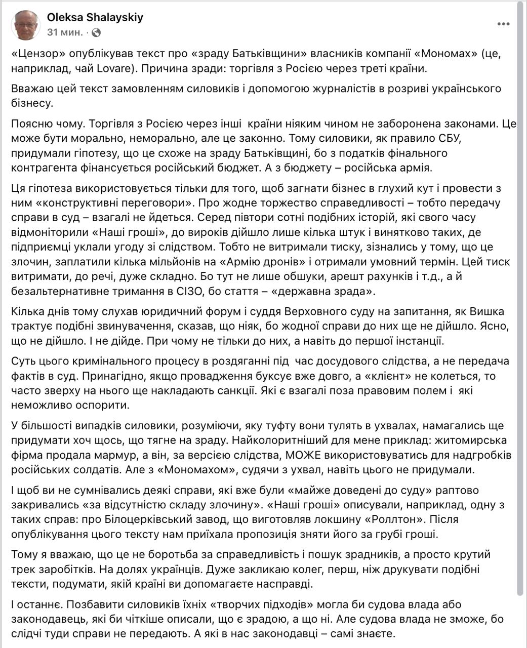 "Ця гіпотеза використовується тільки для того, щоб загнати бізнес у глухий кут і провести з ним "конструктивні переговори". Ні про яку урочистість справедливості – тобто передачу справи до суду – взагалі не йдеться. Серед півтори сотні подібних історій, які свого часу відмоніторили "Наші гроші", до вироків дійшло лише кілька штук і виключно таких, коли підприємці уклали угоду зі слідством. Тобто не витримали тиску, зізналися, що цей злочин, заплатили кілька мільйонів на "Армію дронів" і отримали умовний термін. Цей тиск витримати, до речі, дуже складно. Тому що тут не лише обшуки, арешт рахунків тощо, а й безальтернативний утримання у СІЗО, бо стаття "державна зрада", - розповів Шалайський.