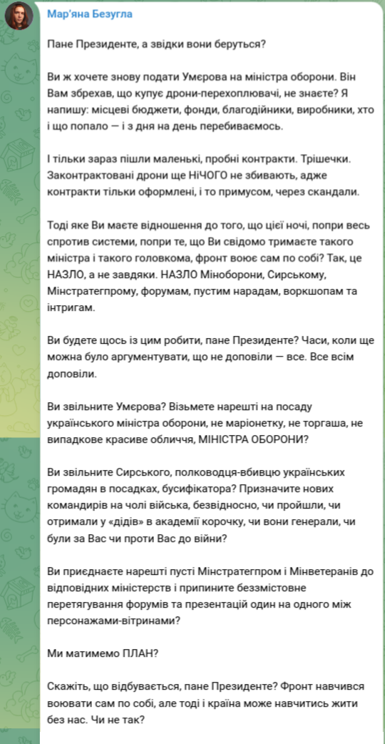 "<...> Ви ж хочете знову подати Умерова на міністра оборони. Він вам збрехав, що купує дрони-перехоплювачі, не знаєте? <...> Тільки зараз були маленькі, пробні контракти.