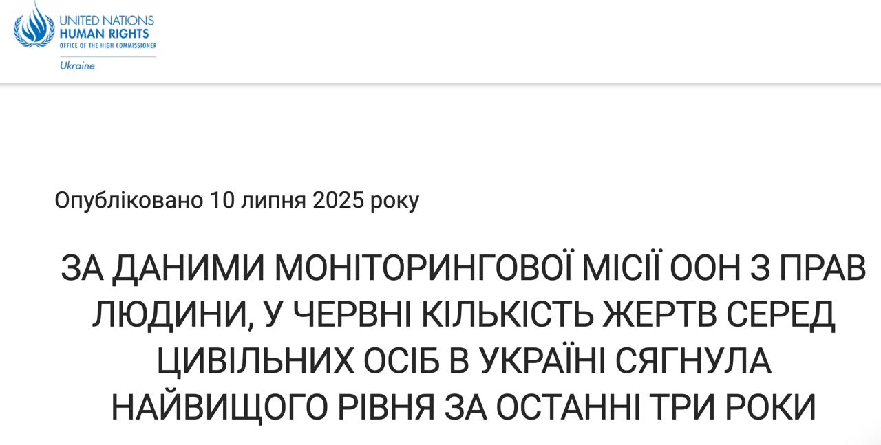 "Громадянське населення по всій Україні стикається з такими стражданнями, яких ми не бачили вже понад три роки", – заявила голова моніторингової місії ООН Даніель Белль. - "Збільшення кількості ракетних ударів далекого радіусу дії та атак безпілотників принесло ще більше смертей та шкоди цивільному населенню у віддалених від лінії фронту районах".