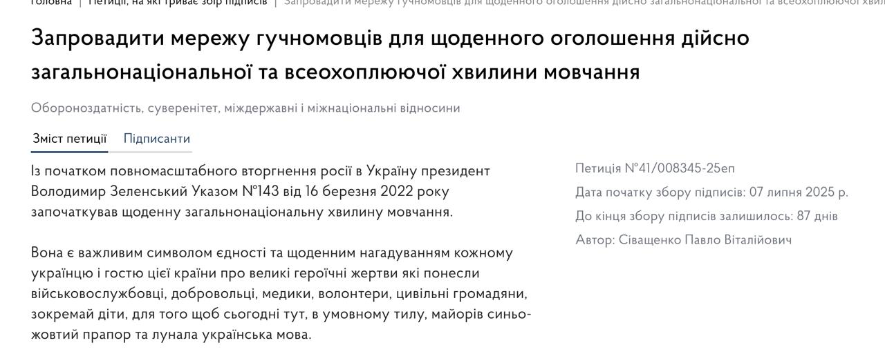 У Кабінет міністрів подали петицію з вимогою встановити по всій країні гучномовці для щоденного оголошення загальнонаціональної хвилини мовчання.