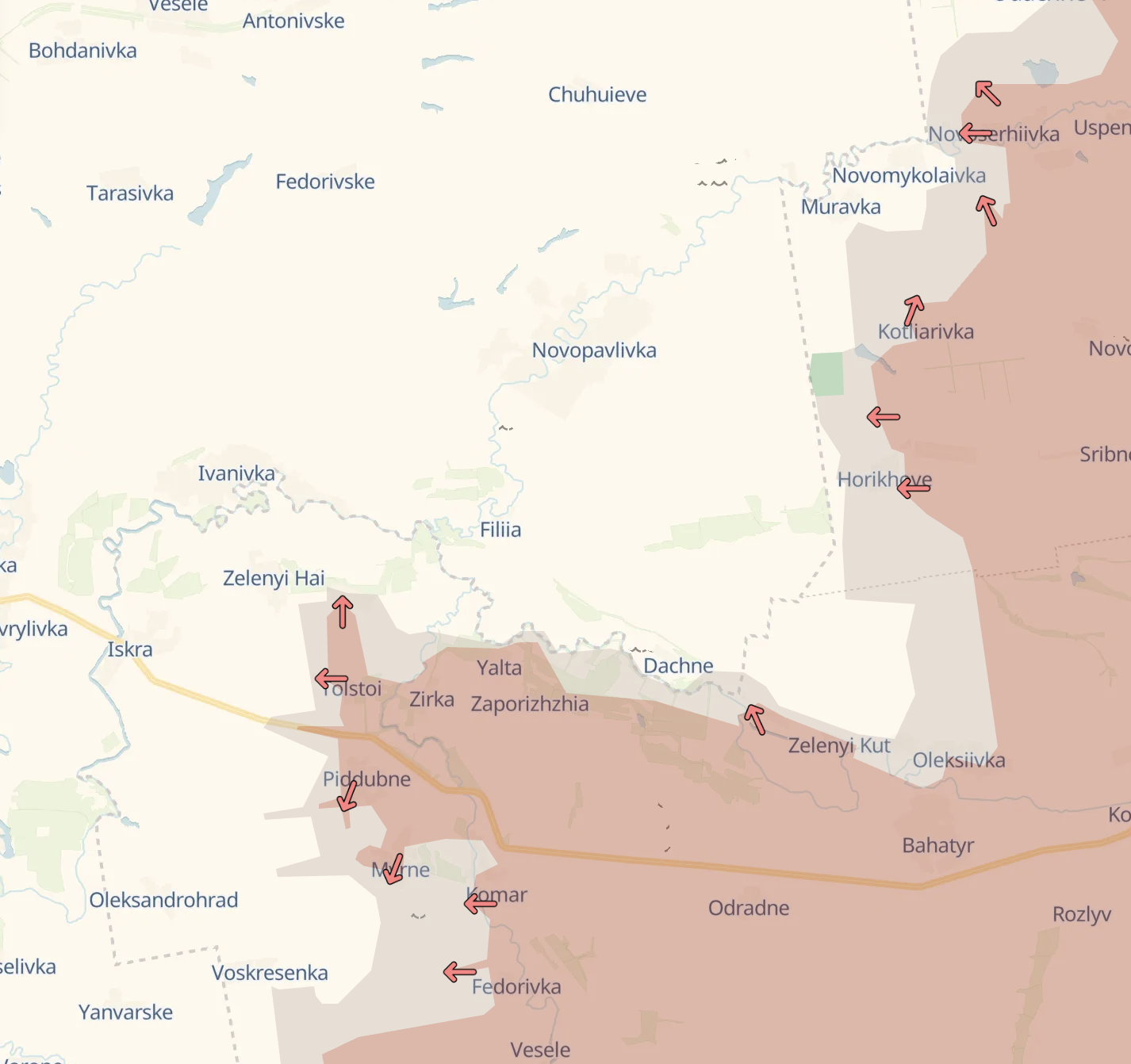 Також, за даними Deep State, РФ знову просунулась у Малинівці Запорізької області (напрямок Гуляйполя). Міноборони РФ сьогодні заявило про захоплення цього села.