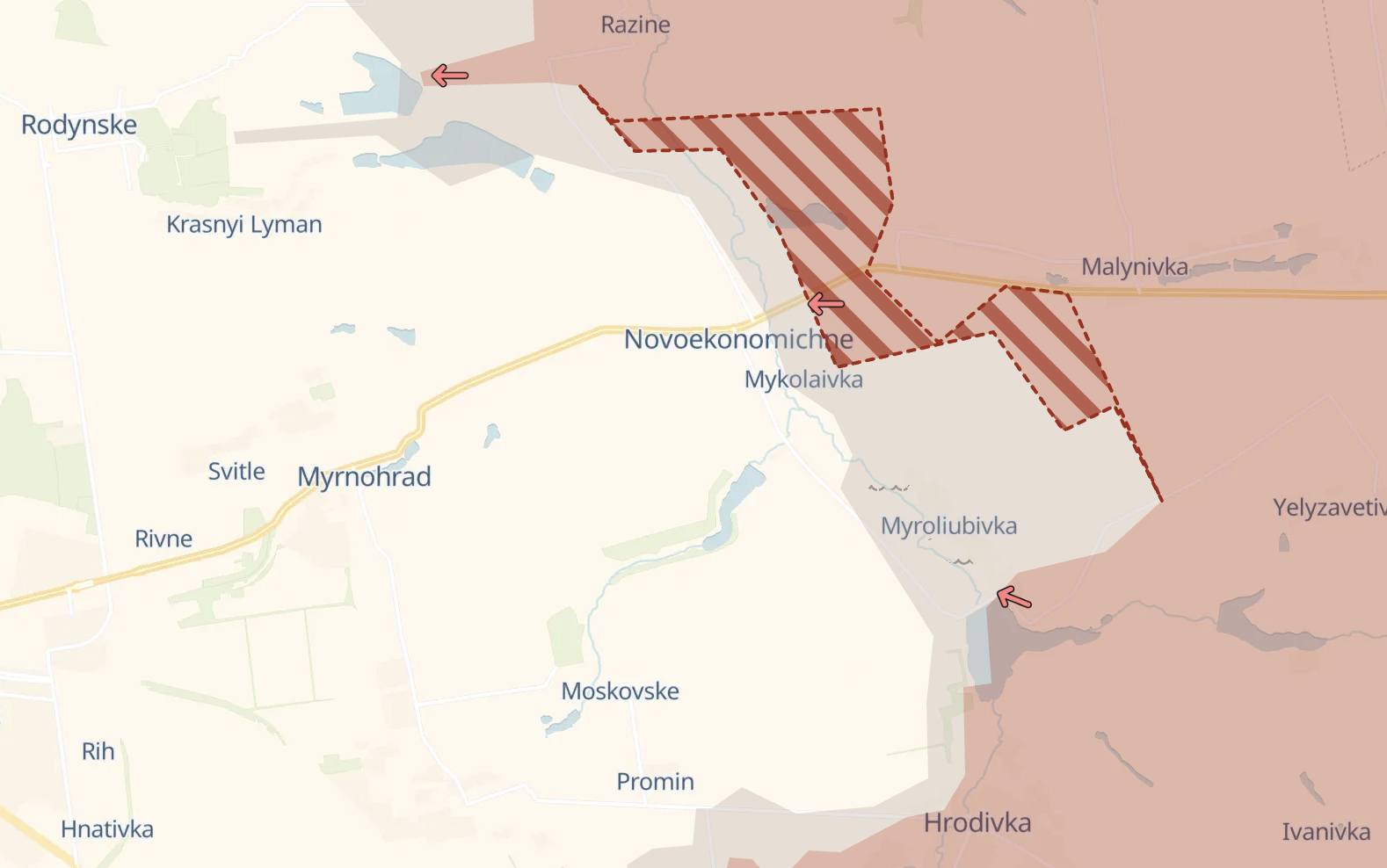 Просування було широким фронтом – на північ і південь від траси на Покровськ. Деякі російські паблики стверджують, що Новоекономіське вже повністю захоплене РФ. Українські джерела цього не підтверджували.
