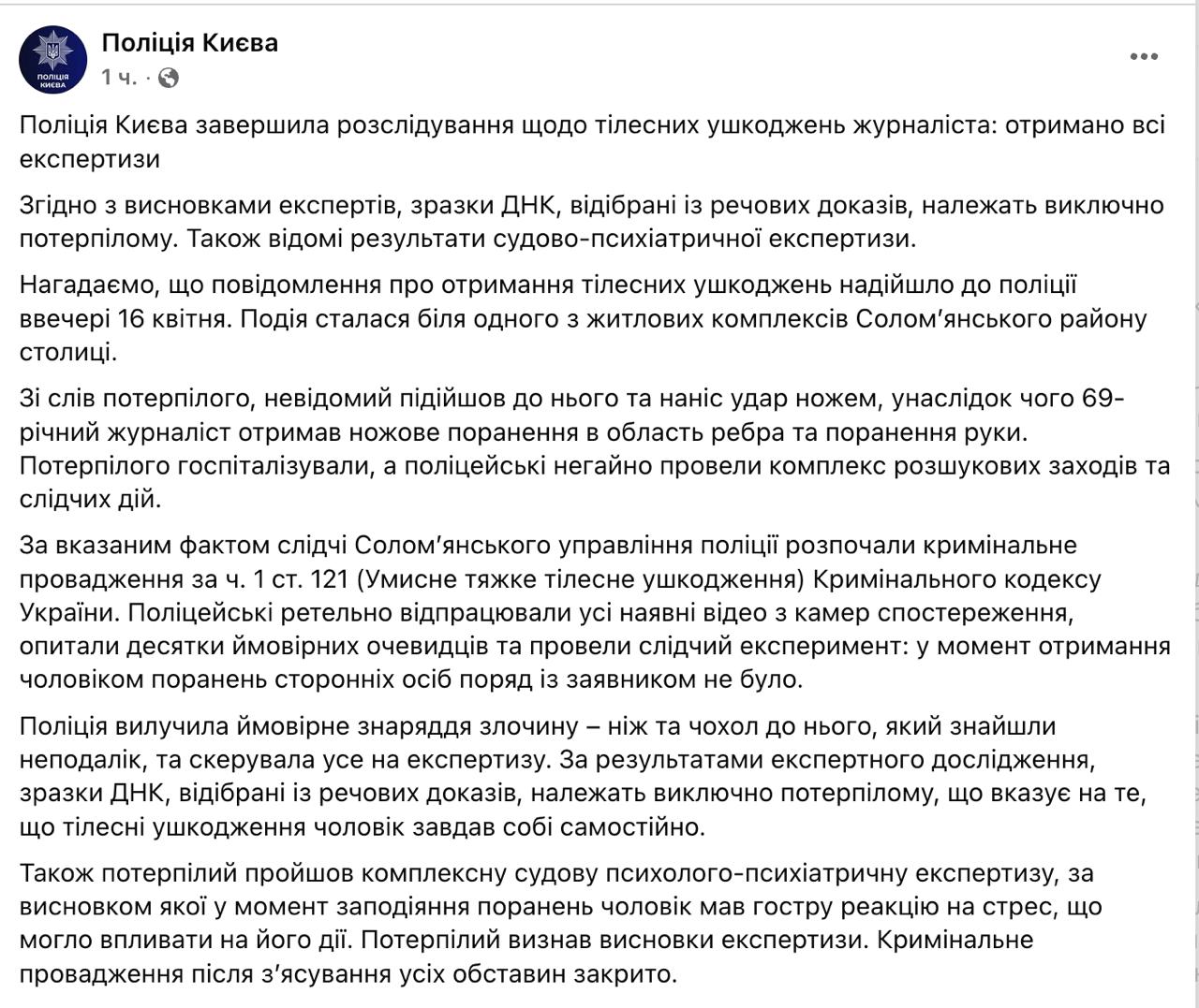 "За результатами експертного дослідження, зразки ДНК, відібрані з речових доказів, належать виключно потерпілому, що вказує на те, що тілесні ушкодження чоловік завдав собі самостійно", - повідомили у поліції.