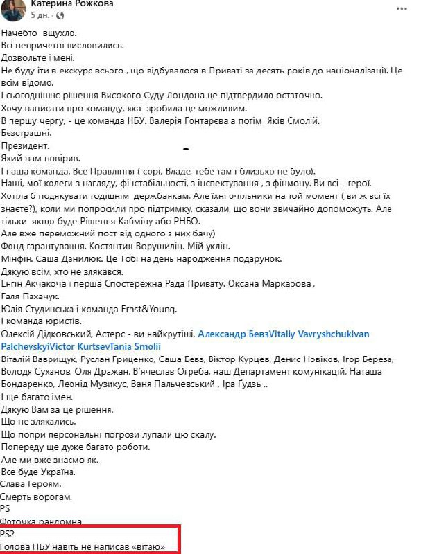 Джерела "Страни" повідомляють, що Пишного підштовхнув до цього пост Рожкової про виграш справи "Приватбанку", в якій вона публічно дорікнула чинному голові НБУ в тому, що він не привітав її з цією перемогою.