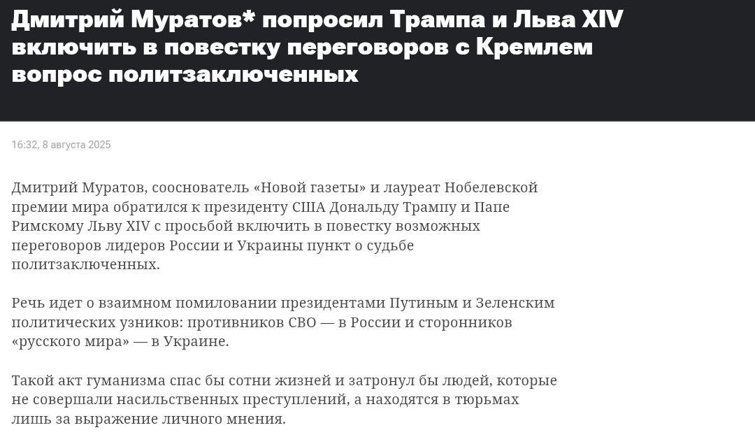 Головний редактор російської опозиційної "Нової газети", лауреат Нобелівської премії миру звернувся до Трампа та папи римського Лева XIV.