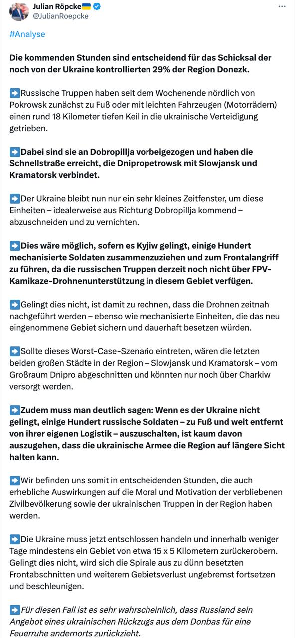 Якщо не ліквідувати прорив, "ланцюжок надто розріджених ділянок фронту та подальших втрат територій продовжиться і прискориться", а Росія може відкликати свою умову виведення ЗСУ з Донбасу в обмін на припинення вогню в інших місцях, пише Рьопке.