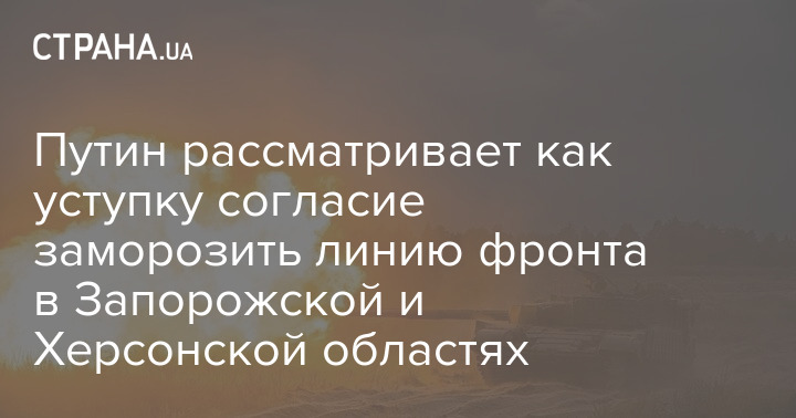 Володимир Путін розглядає як свою поступку згоду заморозити лінію фронту у Запорізькій та Херсонській областях, знявши вимогу щодо виведення з усієї території цих областей українських військ. При цьому від решти вимог він не відмовляється, повідомили Reuters джерела, близькі до Кремля.